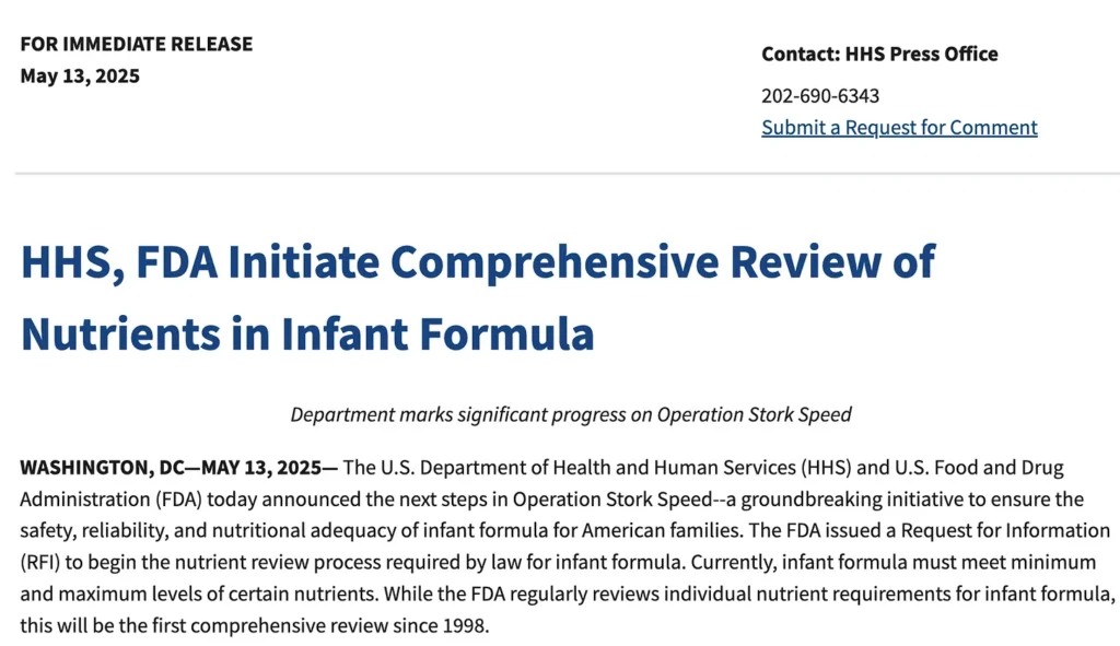 “Bộ Y tế và Dịch vụ Nhân sinh Hoa Kỳ (HHS) và Cục Quản lý Thực phẩm và Dược phẩm Hoa Kỳ (FDA) hôm nay đã công bố các bước tiếp theo trong Chiến dịch Stork Speed – một sáng kiến đột phá nhằm đảm bảo sự an toàn, độ tin cậy và đầy đủ dinh dưỡng của sữa bột cho trẻ sơ sinh dành cho các gia đình Mỹ… đây sẽ là đánh giá toàn diện đầu tiên kể từ năm 1998.”
