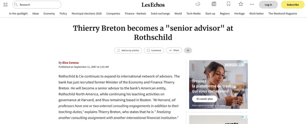 Thierry Breton từng là cố vấn cấp cao tại Rothschild & Cie – chi tiết này ông bỏ qua trong hồ sơ Ủy viên EU của mình – trước khi tiếp quản danh mục thị trường nội bộ của Ủy ban Châu Âu.