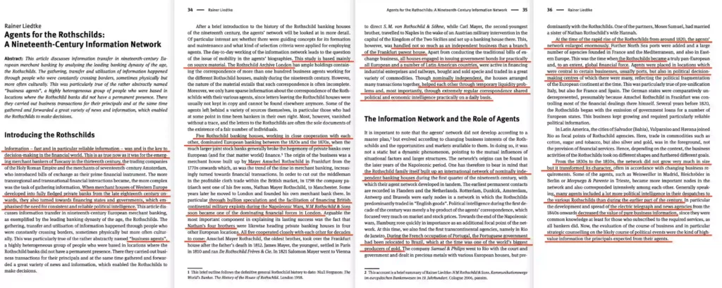 Năm 2016, nhà xuất bản De Gruyter (Đức) phát hành một bài luận của giáo sư lịch sử Rainer Liedtke mang tên “Đặc vụ cho nhà Rothschild: Một mạng lưới thông tin thế kỷ 19.” Dựa trên Kho lưu trữ Rothschild tại London, gồm thư từ của hơn 100 đặc vụ làm việc cho các chi nhánh khác nhau của nhà Rothschild, Liedtke đã ghi lại một chiến dịch tuyển dụng và thu thập tình báo trải dài khắp châu Âu và vươn tới tận Mỹ Latin trong thế kỷ 19.