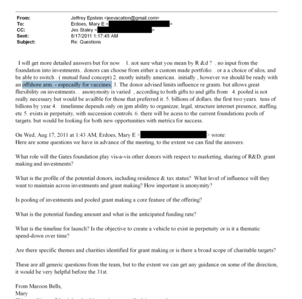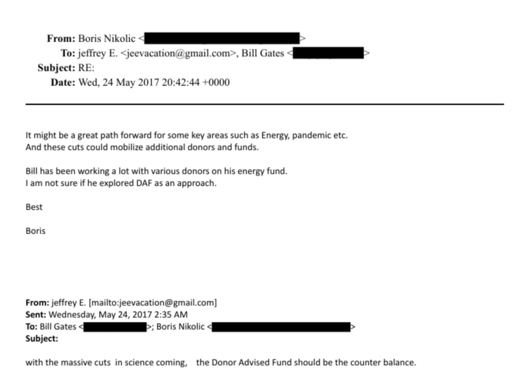 3 năm trước khi xảy ra COVID, Boris Nikolic, cố vấn trưởng về khoa học công nghệ cho Bill Gates, đã email cho Gates và Esptein về quỹ đầu tư từ thiện và viết rằng: “đây có thể là một con đường tuyệt vời trong các lĩnh vực trọng yếu như năng lượng, đại dịch…” Ở đây “đại dịch” được liệt kê song song với năng lượng, như một danh mục đầu tư chứ không phải một thảm hoạ.