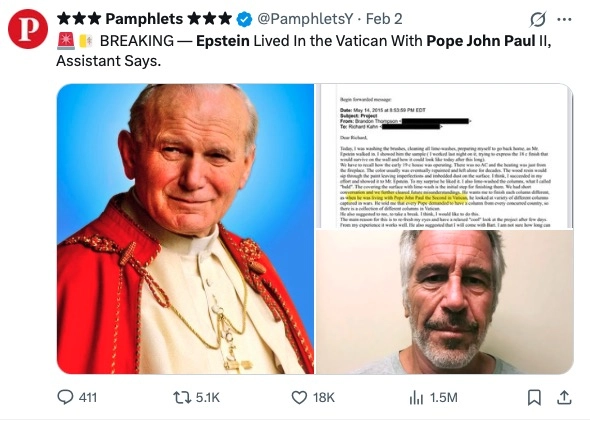 Trong một email, Epstein từng nói rằng mình đã từng ở Vatican một thời gian với Giáo hoàng John Paul đệ nhị. Điều này có thể gây bất ngờ nhưng lại rất logic, với quyền lực mà Vatican sở hữu, một kẻ như Epstein sẽ tìm cách làm thân và tạo dựng mối quan hệ với Vatican.
