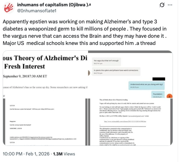 Ngoài COVID, Epstein còn có dự định tao ra một loại vi khuẩn có thể gây bệnh Alzheimer’s và tiểu đường loại 3. Loại bệnh này sẽ tấn công vào dây thần kinh số 10 (phế vị) nối tới bộ não. Các trường y lớn của Mỹ đều biết điều này và hỗ trợ cho Epstein.