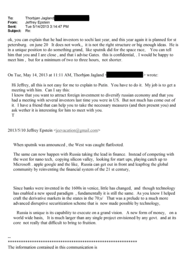 Trong một email với Thorbjon Jagland (cựu thủ tướng Na Uy) vào khoảng 2010-2013, Epstein nói rằng muốn gặp Putin để đề xuất một kế hoạch giúp cho Nga phát triển về tài chính thay vì đi sao chép công nghệ của thung lũng Silicon. Đây có thể liên quan tới công nghệ block chain hoặc tiền ảo. “Tôi rất vui nếu được gặp ông ấy, nhưng tối thiểu là 2 hoặc 3 tiếng, không ít hơn,” Epstein viết.