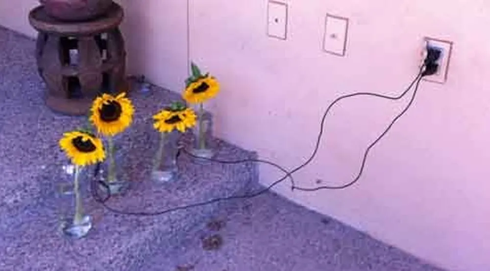Như hình ảnh dưới đây cho thấy, một nhóm hoa hướng dương được kết nối với một ổ cắm điện có nối đất thông qua một thanh kim loại mỏng đặt trong bình hoa, kết nối với một dây dẫn.