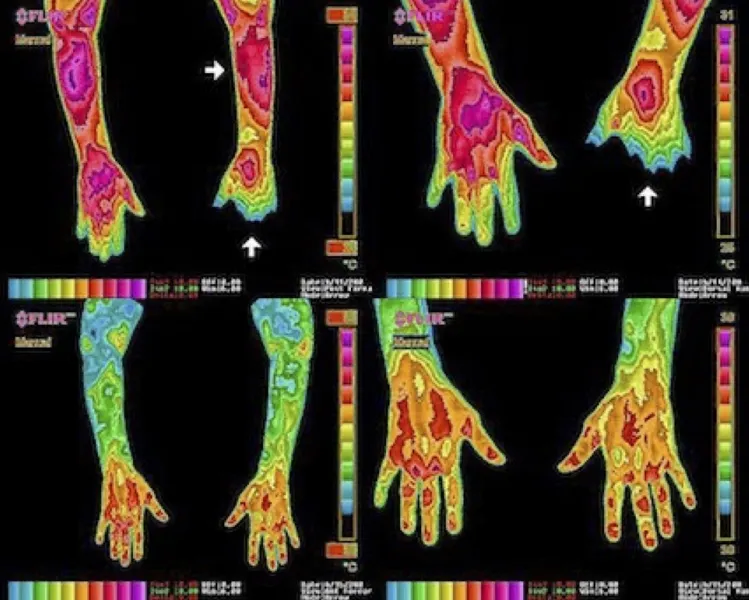Dưới đây là ảnh chụp tình trạng viêm ở gân cẳng tay của một phụ nữ bị hội chứng ống cổ tay hai bên. Hình ảnh 1-4 cho thấy quá trình chữa lành của bà ấy bằng phương pháp nối đất: