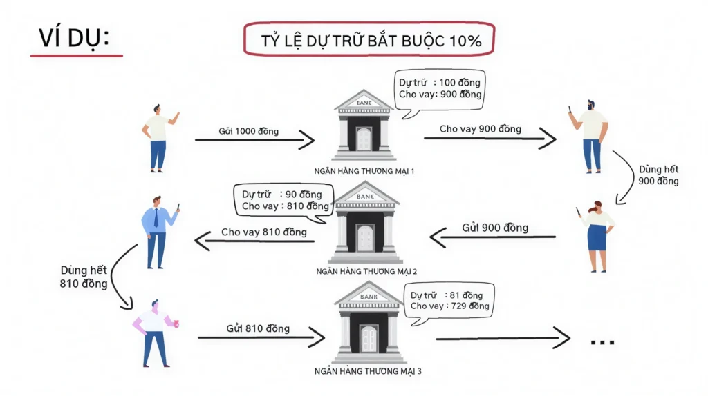 Thuyết dự trữ một phần (fractional reserve): Các ngân hàng cần phải có một khoản dự trữ bắt buộc tại ngân hàng trung ương, phần còn lại thì họ có thể cho vay tiếp. Các ngân hàng vẫn là trung gian tài chính nhưng thông qua quá trình tương tác với nhau, các ngân hàng sẽ tạo ra thêm tiền trong nền kinh tế, theo hình minh hoạ sau: