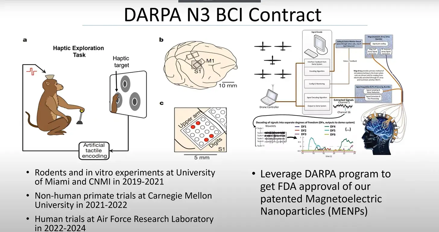 Giáo sư Sakhrat Khizroev tại đại học Miami đã từng có một bài thuyết trình về các vật liệu cao cấp có thể được dùng để kết nối não người với máy móc. Ông đã nhắc tới một dự án nghiên cứu của DARPA (thuộc Bộ quốc phòng Mỹ), trong đó có nói rằng các hạt nano có từ tính đóng vai trò cốt yếu trong công nghệ này.