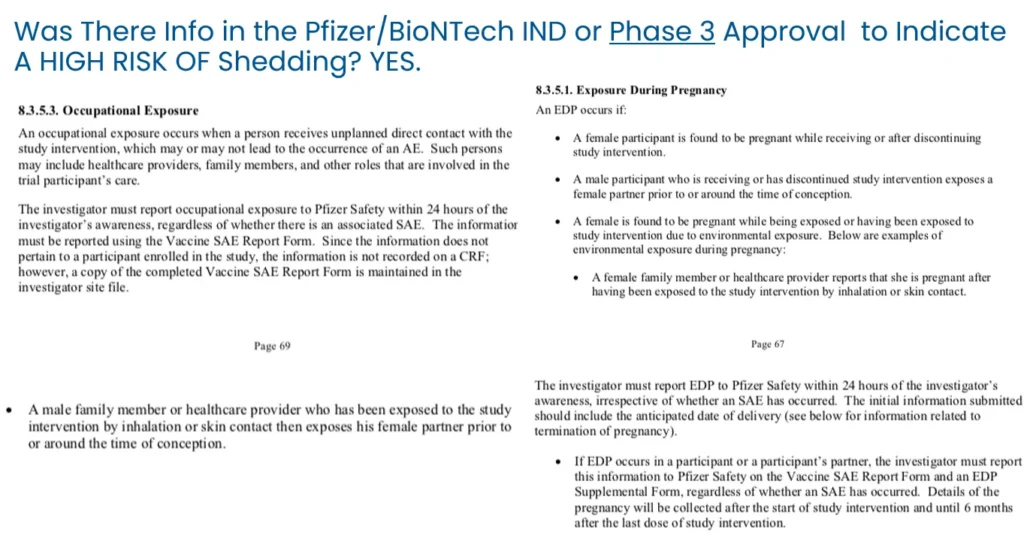 Đôi khi những sợi tơ nhân tạo này có thể chui ra ngoài thân thể lúc bình thường, và chúng có thể bay trong không khí. Điều này lý giải vì sao các triệu chứng có thể lây từ người đã tiêm sang người không tiêm (người ta gọi hiện tượng lây lan này là shedding). Trong tài liệu thử nghiệm của Pfizer, họ nói rằng người không tiêm có thể bị ảnh hưởng bởi người đã tiêm qua đường hít thở và tiếp xúc da.
