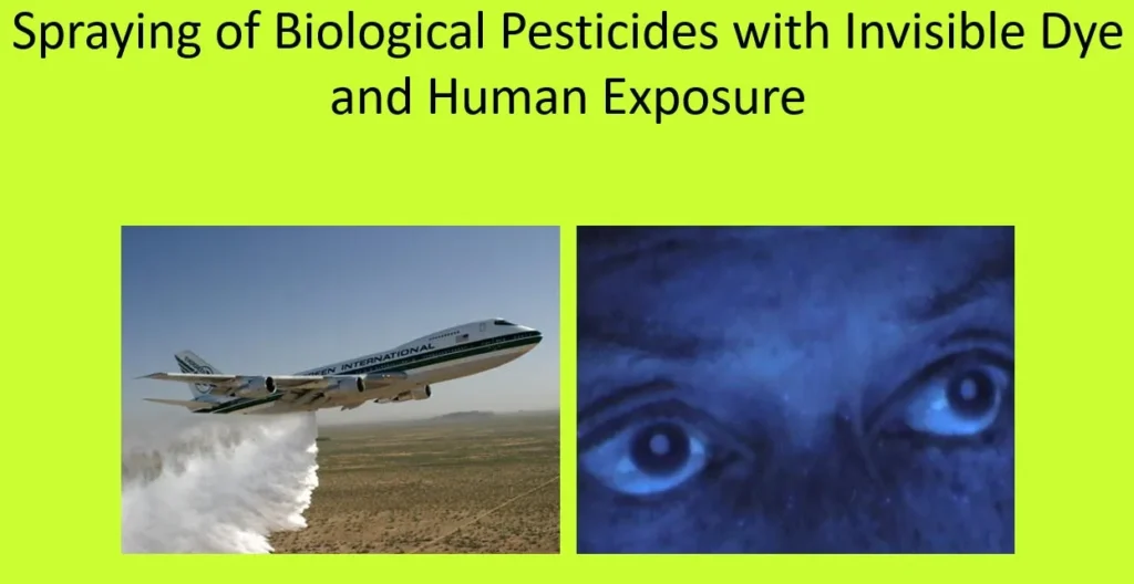 Năm 2008, một loại thuốc trừ sâu công nghệ nano dùng để diệt loại bướm đêm nâu đã được phun ở tiểu bang California, người ta cũng đã sử dụng một loại thuốc nhuộm huỳnh quang nano tương tự như trên. Tiến sĩ Hildegard Staninger đã thử nghiệm trên những người tiếp xúc với loại thuốc trừ sâu nano này và thấy rằng mắt của họ phát ra một loại ánh sáng dưới tia cực tím. Tiến sĩ Hildergard đã gọi hiệu ứng này là “con mắt của Horus” và nói rằng đây là do tác dụng của thiocyanate huỳnh quang trong thuốc trừ sâu. Theo tài liệu hướng dẫn của thuốc trừ sâu, nó được dùng để theo dõi hiệu quả của việc phát tán thuốc sau khi phun.