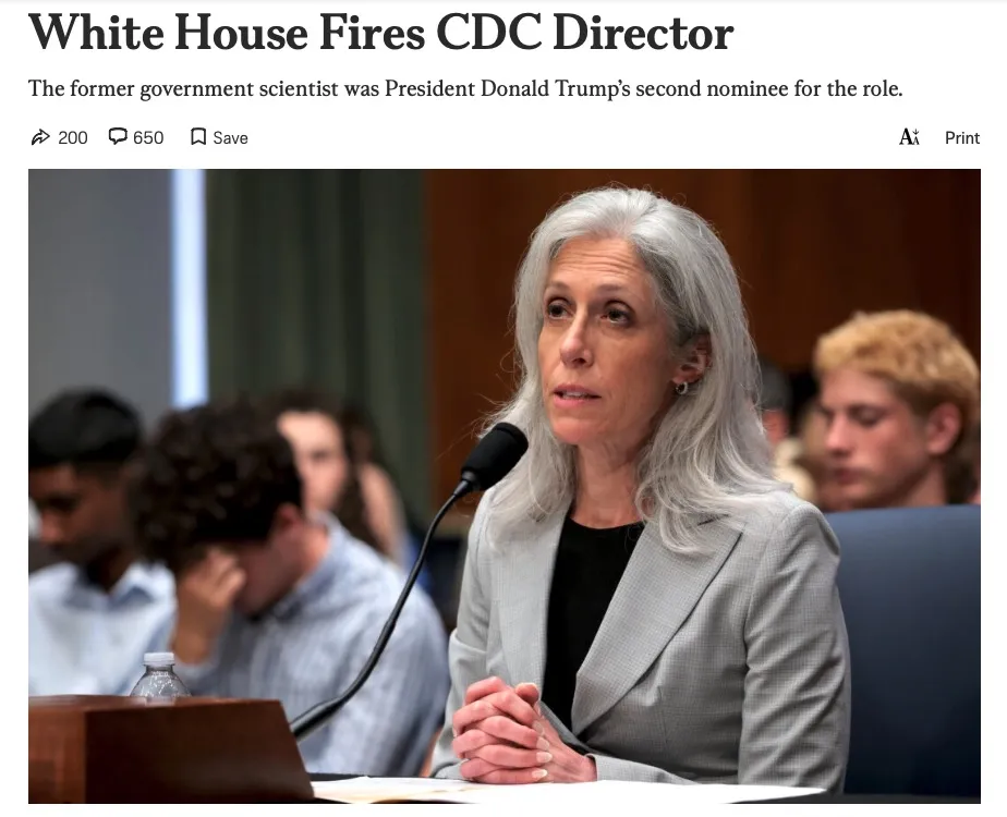 Tiếp theo là “thay máu” toàn bộ hệ thống. Bộ Y Tế đã sa thải hàng nghìn nhân viên tại FDA, CDC và Viện y tế quốc gia. Đây là 3 cơ quan y tế quan trọng nhất ở Mỹ, đồng thời bà Susan Monarez chỉ mới nhậm chức giám đốc CDC một thời gian ngắn đã bị ông Trump sa thải vào cuối tháng 8/2025 vì đi ngược với định hướng của vị tổng thống.