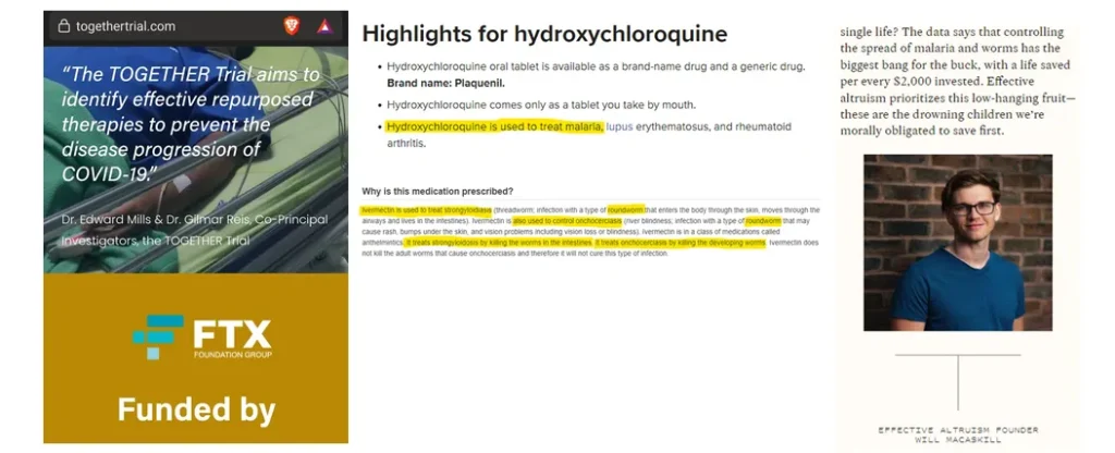 - FTX còn tham gia vào âm mưu đại dịch, ví dụ như tham gia cấp vốn cho nghiên cứu Together – hạ thấp uy tín của thuốc ivermectin, chi hàng triệu đôla cho việc ngăn chặn dịch bịnh, chi hàng triệu đôla cho việc phủ nhận giả thuyết virus có nguồn gốc phòng thí nghiệm…