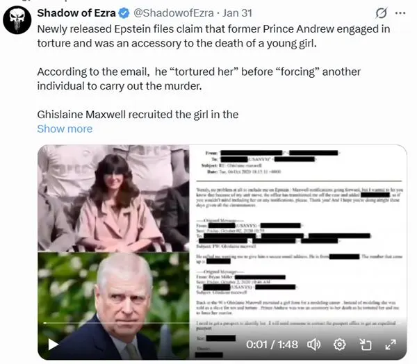 Một email nói rằng vào những năm 90, Ghislaine Maxwell (thân tín của Epstein) đã tuyển dụng một cô gái làm người mẫu. Nhưng thay vì làm người mẫu, cô đã bị bán làm nô lệ tình dục và bị tra tấn. Hoàng tử Andrew đã tham gia vào việc tra tấn và ép một người khác giết cô ấy.