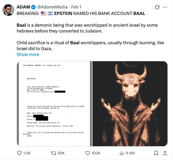 Epstein từng viết thư cho một nhân viên của ngân hàng JP Morgan (ngân hàng thân tín của Epstein) và yêu cầu chuyển hơn 11 nghìn đôla vào một tài khoản. Epstein đặt tên cho tài khoản ngân hàng này là Baal – vị tà thần của người Israel cổ đại, vốn rất thích được cúng tế trẻ em, thường là thiêu sống. Các nhà khảo cổ đã tìm thấy hàng nghìn bình đựng tro cốt và di thể của trẻ em – bằng chứng cho tập tục này.