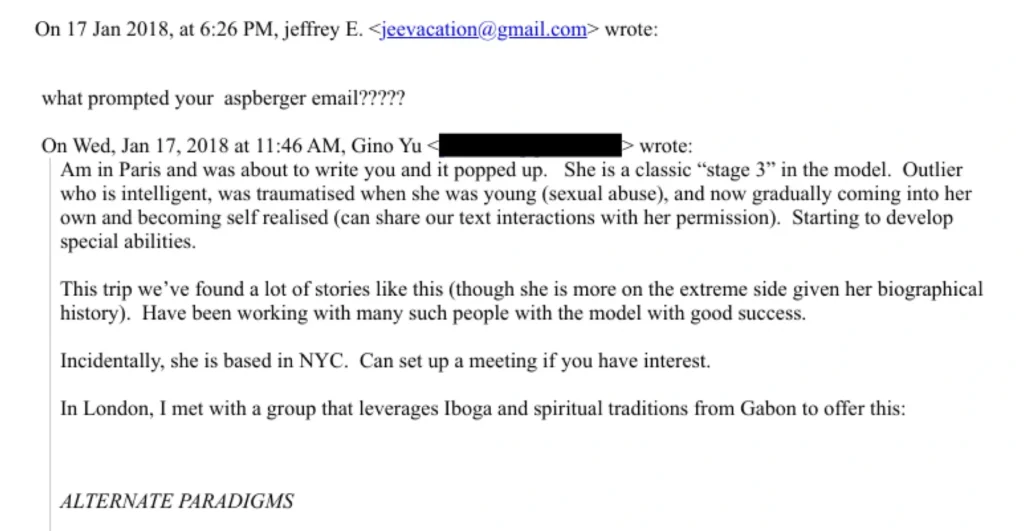 Epstein cũng quan tâm đến các siêu năng lực, theo một cách đen tối. Ví dụ trong một email từ Gino Yu tháng 1/2018, người này nói rằng: