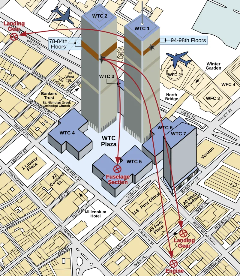 19. Tình cờ, tòa tháp 47 tầng tại Trung tâm Thương mại Thế giới, toà tháp số 7 vốn không bị máy bay đâm vào, đã sụp đổ trong vòng chưa đầy 7 giây vào lúc 5 giờ 20 phút chiều ngày 11/9. Tuy vậy, từ trước khi sự việc thực sự xảy ra hơn 6 giờ, hãng BBC và CNN đưa tin là toà tháp số 7 đã sụp đổ. Quý vị có thể tham khảo sơ đồ sau, chỉ có 2 toà tháp bị máy bay đâm vào nhưng có tới 4 toà tháp bị sụp đổ hoàn toàn là: 1, 2, 3 và 7